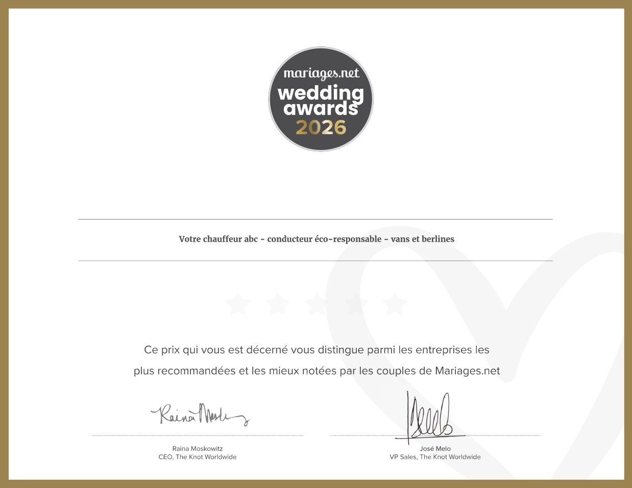 Cette année, Votre Chauffeur ABC Conducteur éco-responsable a l’immense honneur de recevoir le Wedding Award 2026, titre national de Meilleur prestataire de transport mariage Berline, Van et Autocar, décerné lors de la 12ᵉ édition.