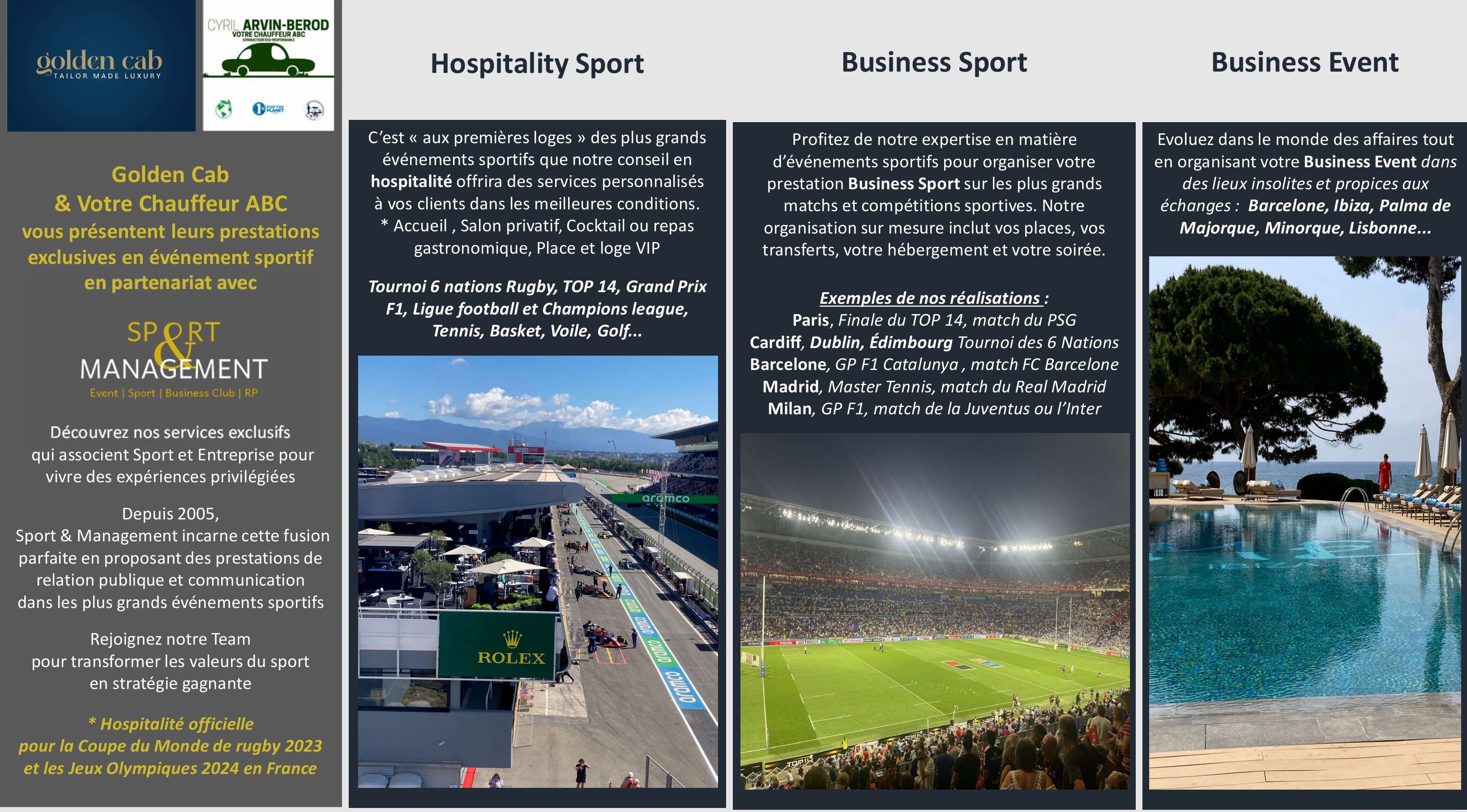Votre Chauffeur ABC, spécialiste du transport haut de gamme, partenariat exclusif avec Sport & Management, expert de l’hospitalité sportive depuis 2005.